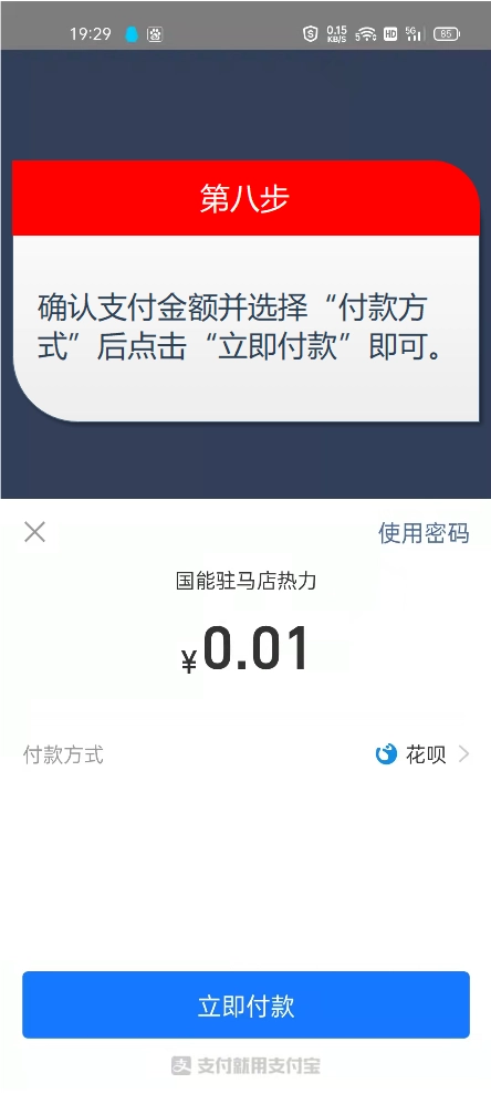 第八步:于弹出的支付界面,确认好金额与付款方式,接着点击“立即付款”,完成支付,缴费便随之完成。