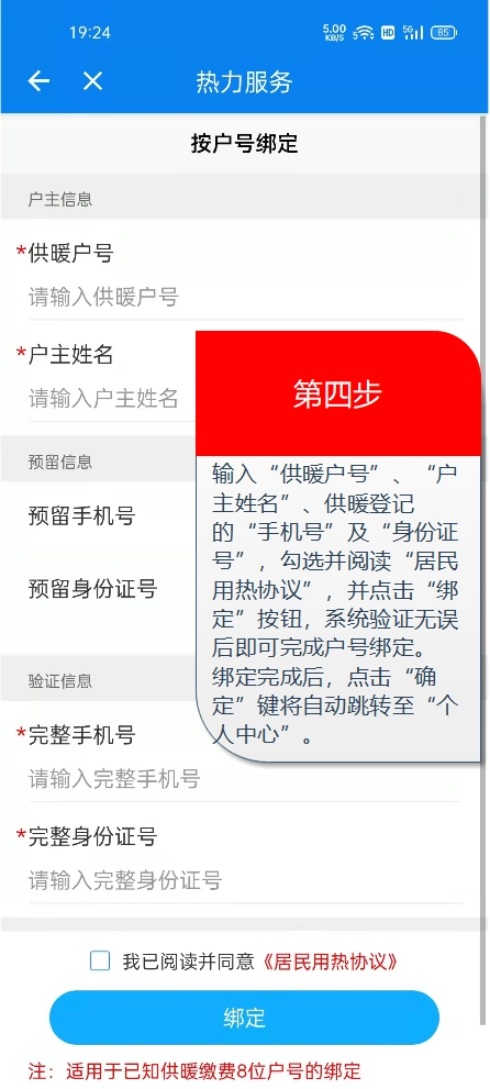 第四步:(以按户号绑定为例)依次填写“供暖户号”、“户主姓名”、“完整手机号”、“身份证号”,阅读并勾选“我已阅读,并同意居民用热协议”,确认信息准确无误后,点击“绑定”按钮。