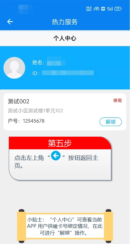 第五步:完成绑定后,系统会自动跳转至个人中心,在此处能够查看用户号与用户的绑定状态。点击返回按钮,即可跳转回主页。