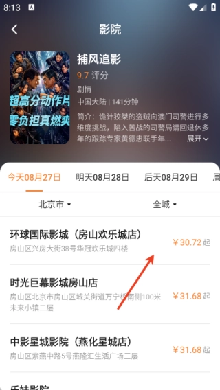 3、具备便捷的影院查找功能,可依据位置进行筛选,还能查看影院的排片以及票价信息。