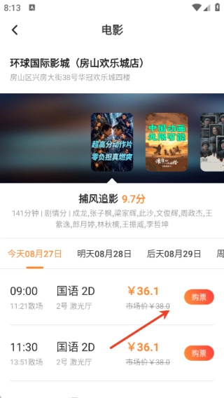 3、然后查看具体的时间和场次,选择好后点击后面的购票按钮;