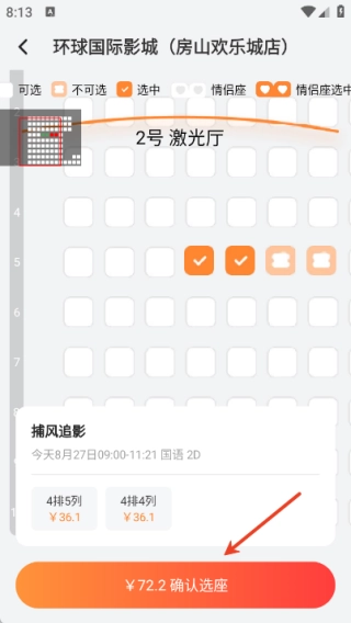 4、接下来选择座位,并点击确认选座,随后进入支付页面完成支付即可。