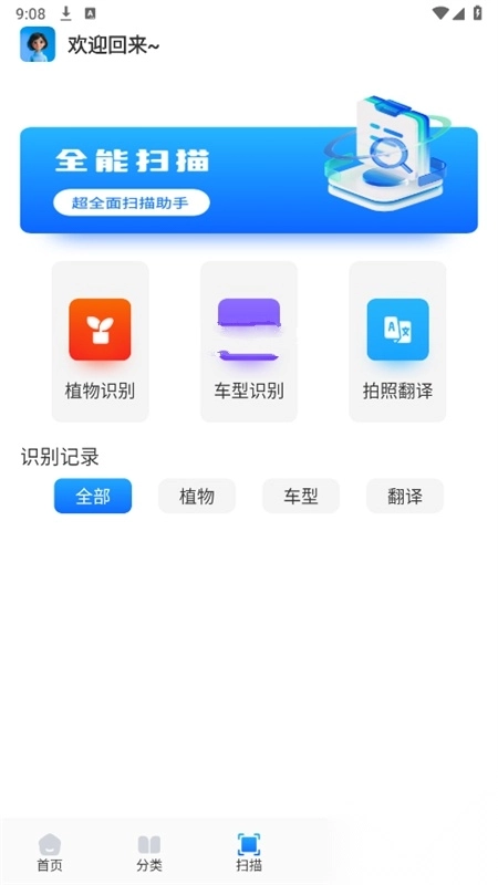 5、点击扫描,这里还为大家提供了植物识别、车型识别等扫描功能