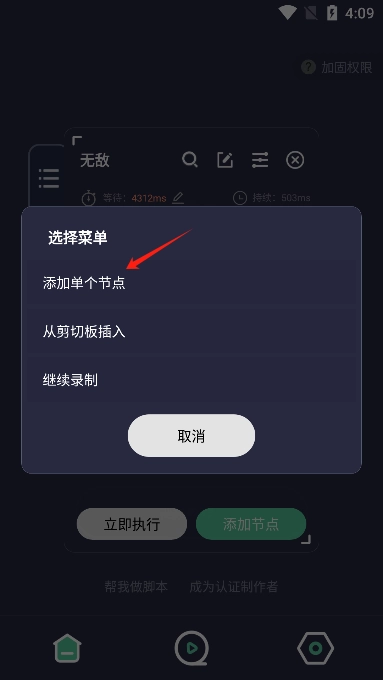 6、当脚本制作完毕,你能够选择即刻执行,也可以选择添加节点。