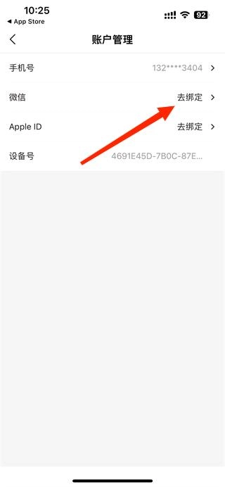 4、当您进入账号管理页面后,能够进行手机号更换操作,也可以查看设备号。若您想要绑定微信,点击“微信去绑定”即可。
