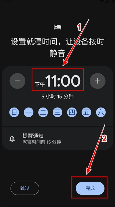 5. 就寝时间闹钟提醒已设置完成,具体设置状态如下图所示。