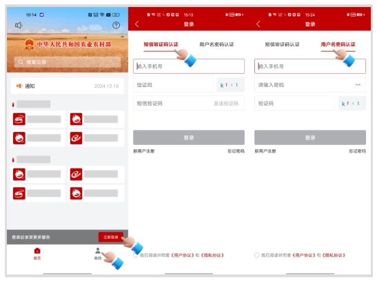第二步:您可依据自身需求,从【手机短信验证码】与【用户名密码】这两种方式中选择其一进行登录。