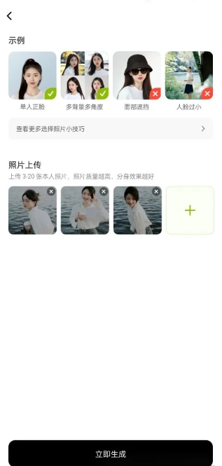 2、根据提示上传自己的照片,需要3-20张照片,越多越像你自己。