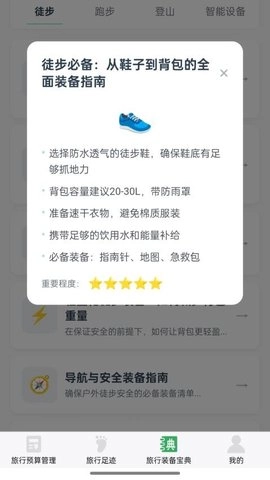 1、用户能够依据自身需求,随时制定与调整行程规划,同时还提供针对特定活动的专业装备推荐,助力用户在出行前做好全面准备。