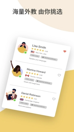 2. Cambly安卓版打造了一个迷你国际课堂,配备一名外籍教师,容纳3名学员。无需出门,你就能与来自五湖四海的同学共同学习,体验多元文化,这样的机会不容错过。